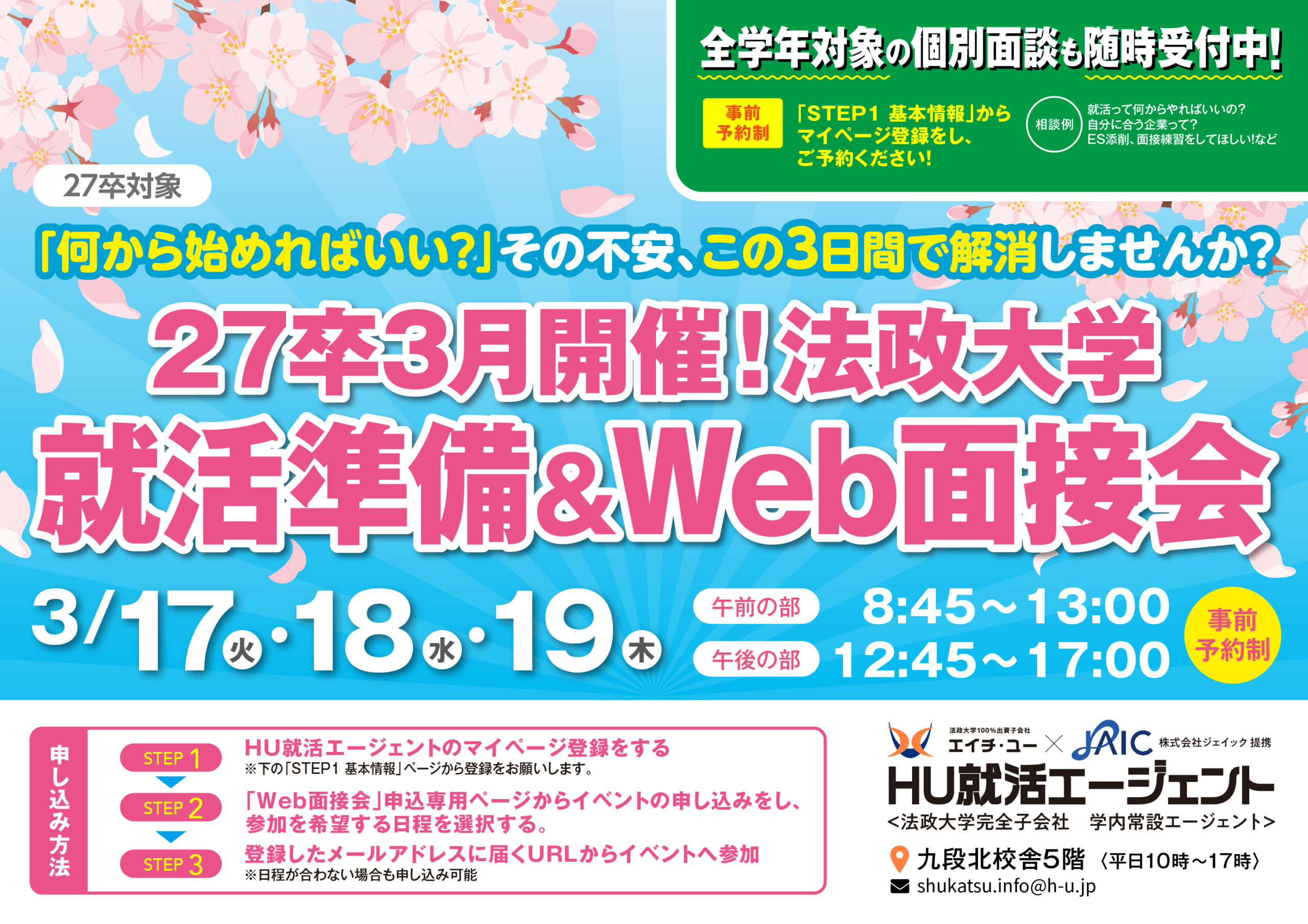 ※「HU就活エージェント」は、株式会社エイチ・ユーと株式会社ジェイックによる法政大学キャンパス内の就職エージェント事業です。